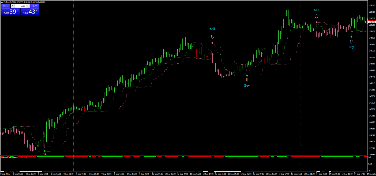 Para comprar, procure um ponto verde no indicador PLT confirmado por linhas verde e azul no indicador I-Gentor LSMA&EMA. Para vender, procure um ponto vermelho no PLT confirmado por linhas vermelha e amarela no I-Gentor LSMA&EMA.