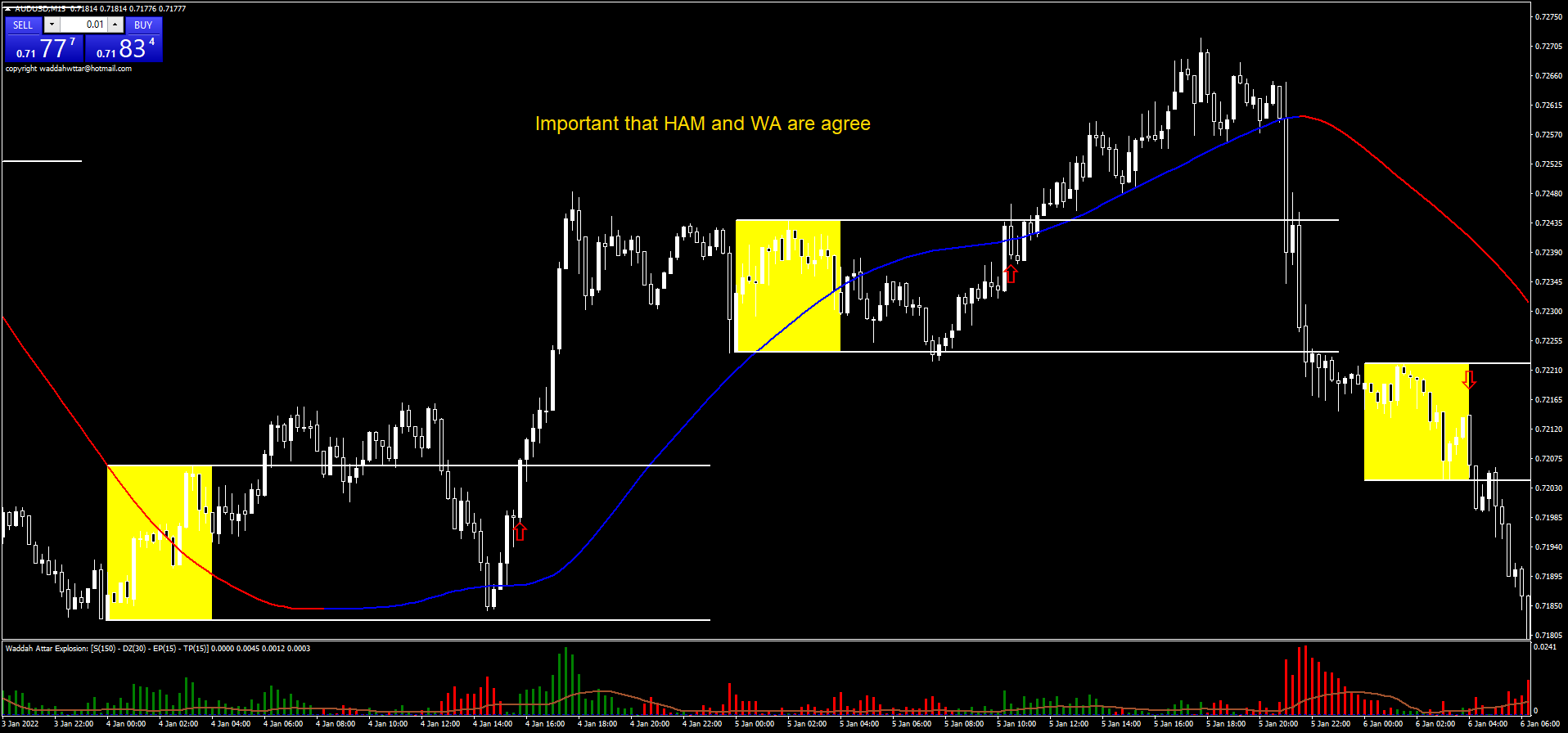 - Confirmação do Waddah Attar: Além disso, o indicador Waddah Attar deve mostrar barras verdes (alta) ou vermelhas (baixa) acima da média móvel, indicando que o mercado está forte na direção do rompimento.