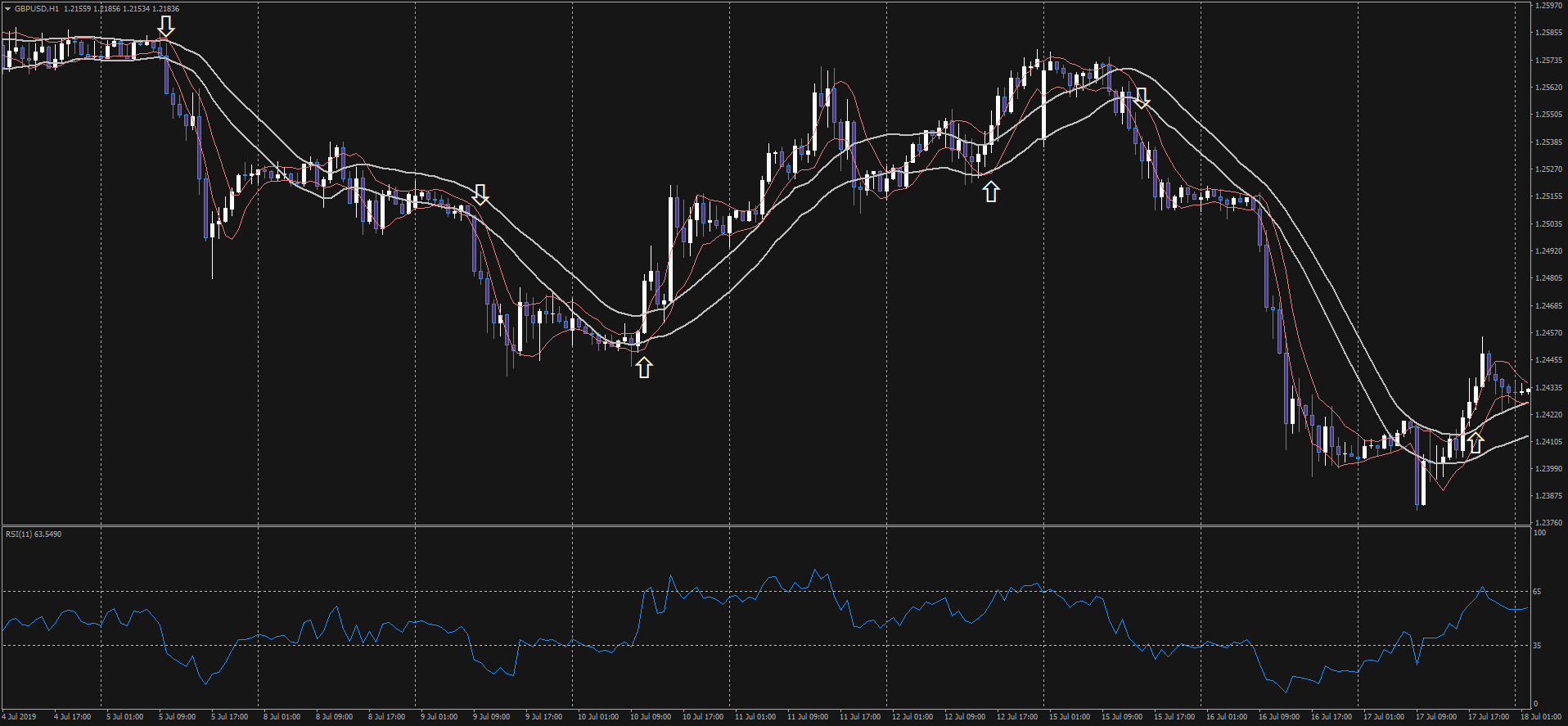 2. A linha do RSI cruza o nível 65 de baixo para cima.