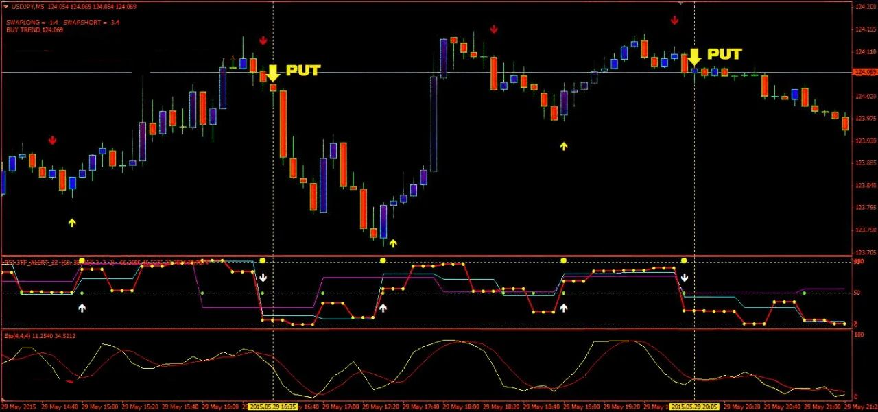 Sinais de venda (PUT): Seta vermelha no gráfico, seta branca do RSI apontando para baixo e linha amarela do Estocástico abaixo da linha vermelha.