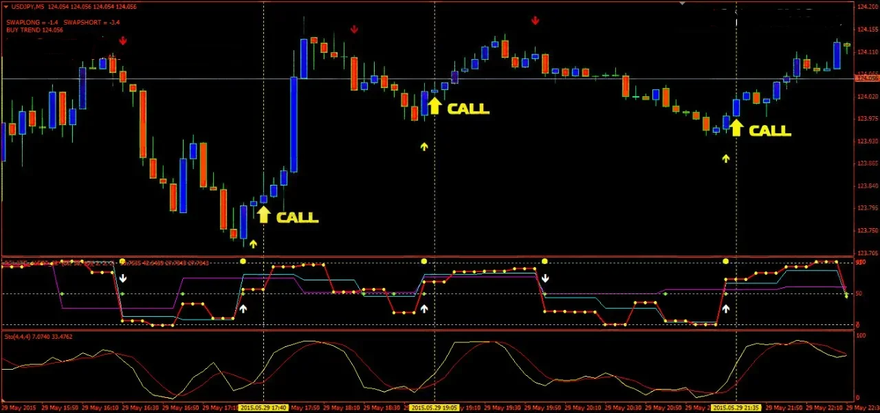Sinais de compra (CALL): Seta amarela no gráfico, seta branca do RSI apontando para cima e linha amarela do Estocástico acima da linha vermelha.