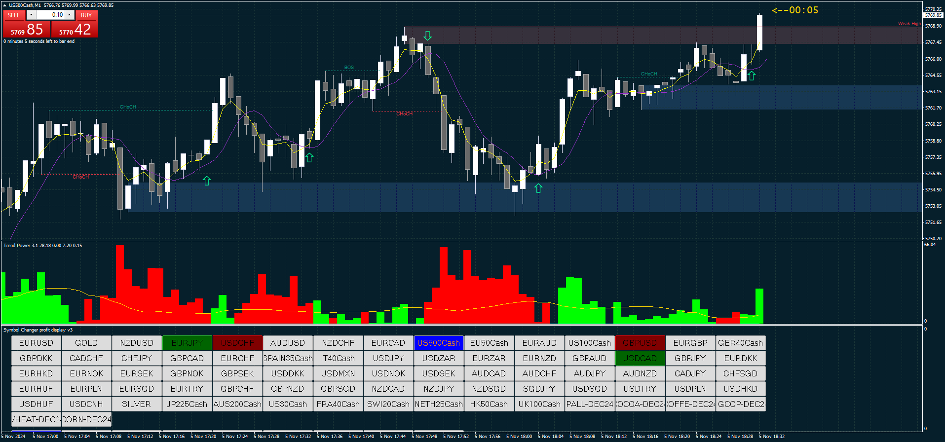 - Indicador de Força de Tendência: Configurado com Sensibilidade: 150, Zona Morta: 15, Poder de Explosão: 15, Força de Tendência: 15, este indicador ajuda a confirmar a direção da tendência.