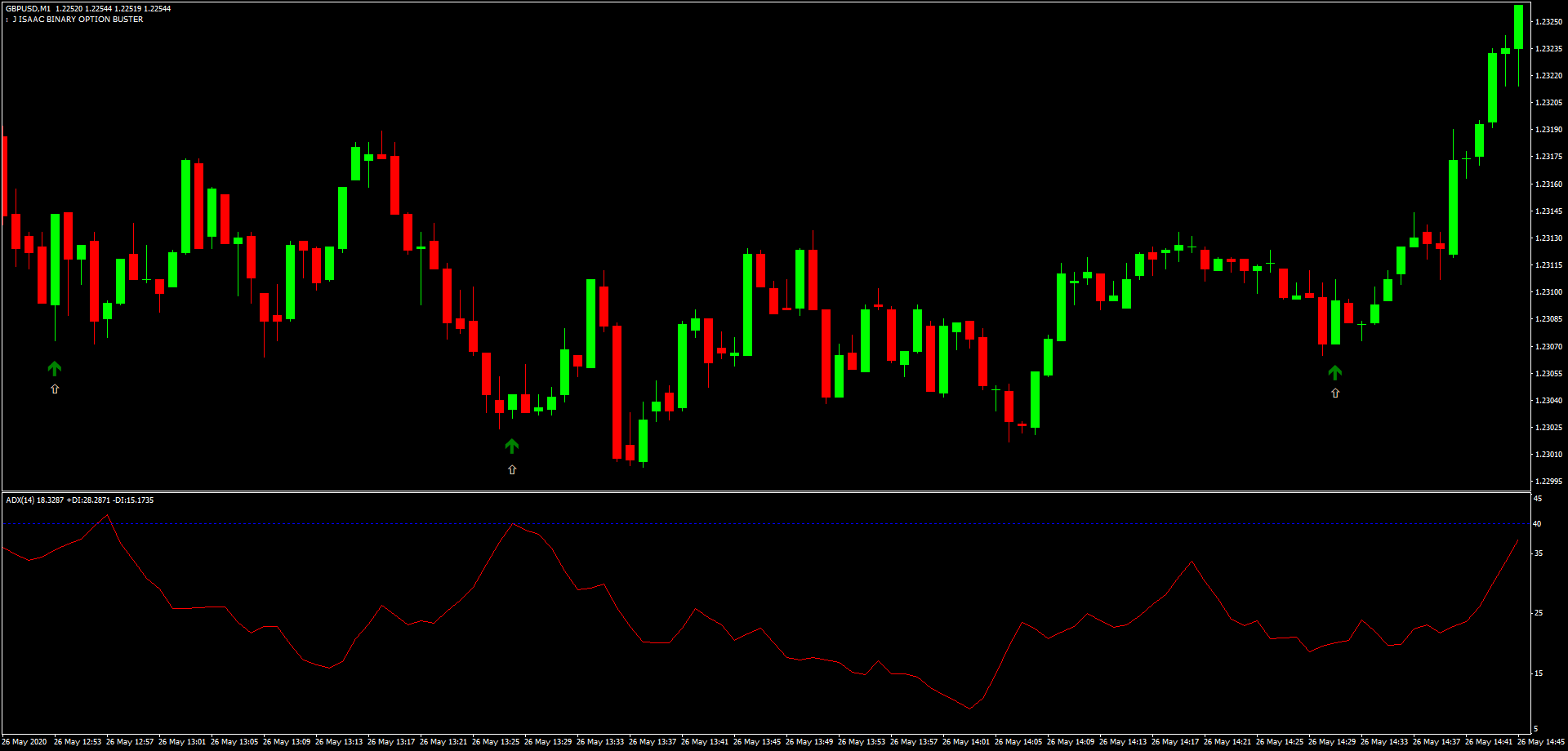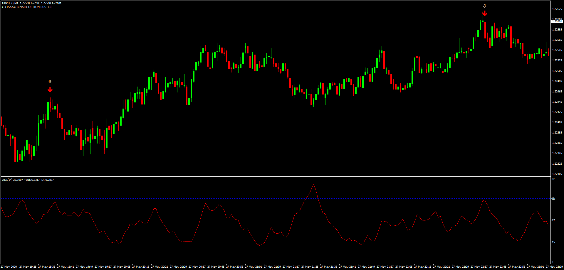 Os principais componentes da estratégia ADX Combo incluem o indicador ADX, configurado com um período de 13 e um nível de 40, e o indicador Binary Buster, que fornece setas de reversão e momentum.