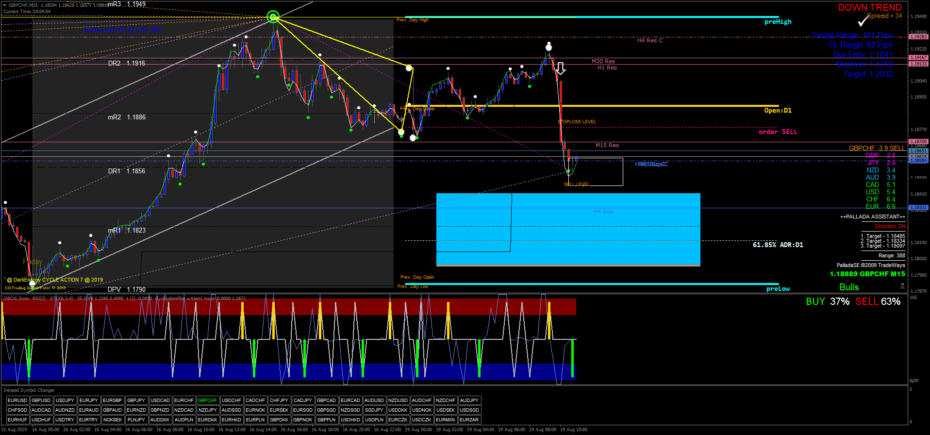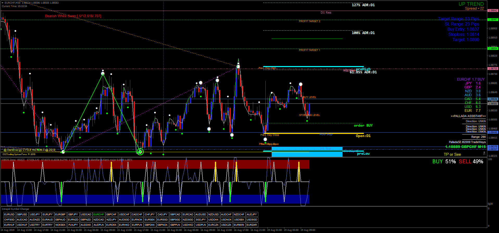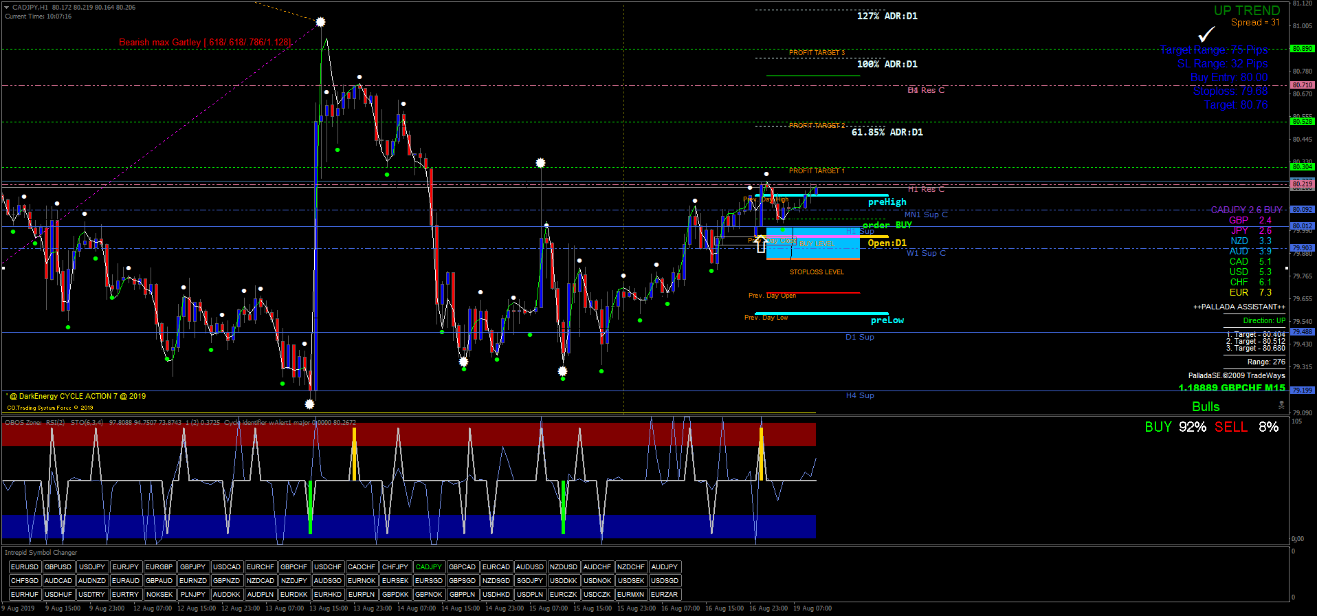 A estratégia utiliza indicadores como TPN, Pallada Assistant, TLBOC V.3, Quantum mod Oedit, Currency Strength, Sun Volume, Buy Sell Alert, Fibcalc 34 Zup 148, Zig Zag V2 NRPFT Dominator Trend Signal, X-daily Targets, DTM 2.4, RSI Sto WPR Obos Zone, ABO Indicator, Cycle Identifier W Alert e Intrepid Cycle Changer.