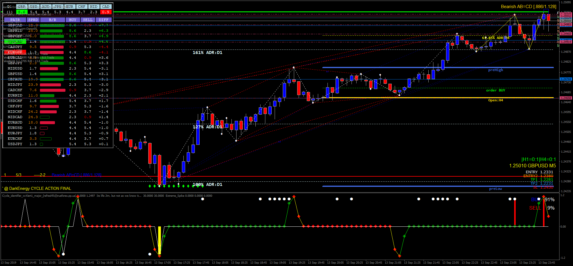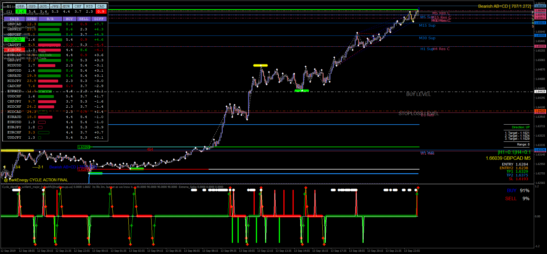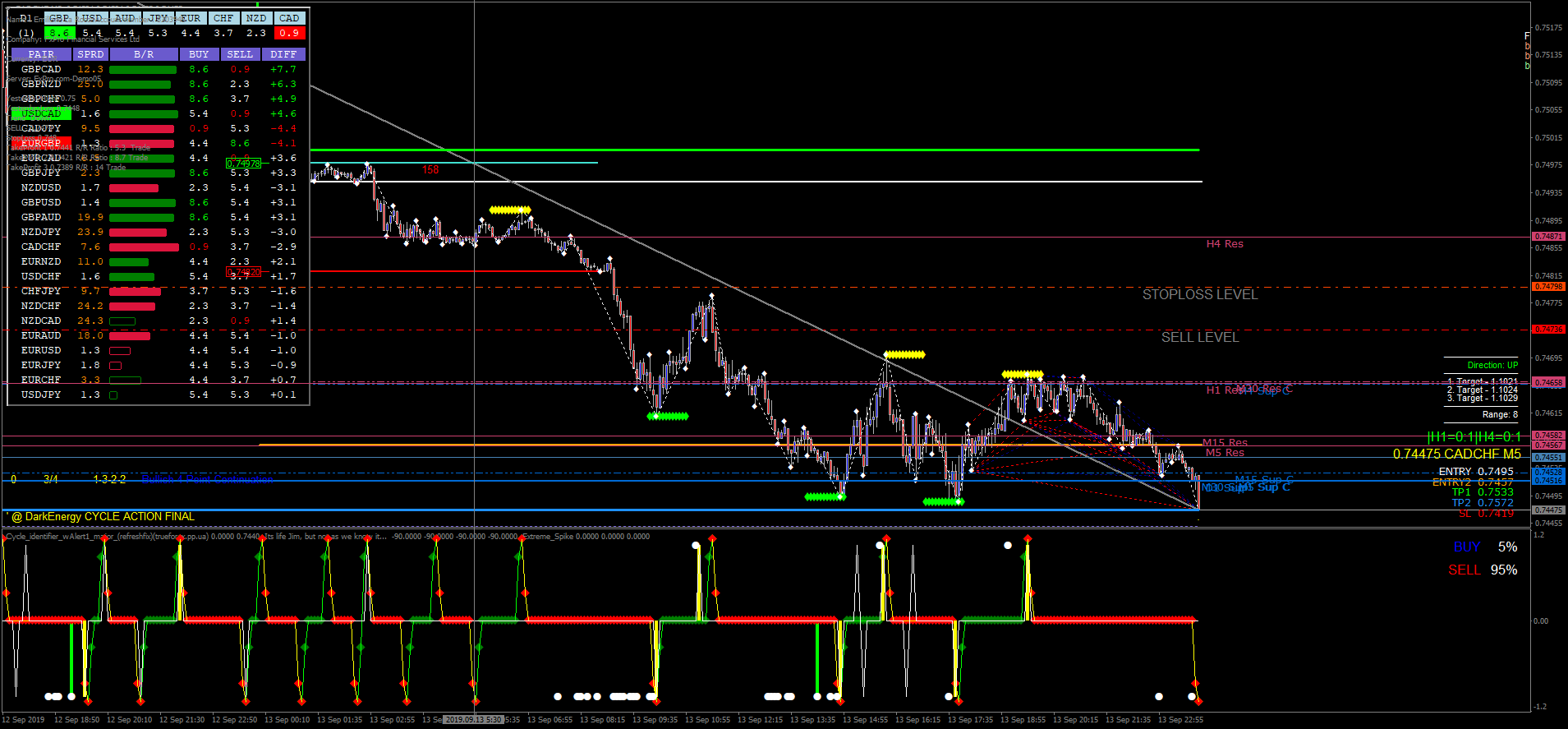 A estratégia utiliza indicadores como TPN, Pallada Assistant, TLBOC V.3, Quantum mod Oedit, Currency Strength, Sun Volume, Buy Sell Alert, Fibcalc 34 Zup 148, Zig Zag V2 NRPFT Dominator Trend Signal, X-daily Targets, DTM 2.4, RSI Sto WPR Obos Zone, ABO Indicator, Cycle Identifier W Alert e Intrepid Cycle Changer.