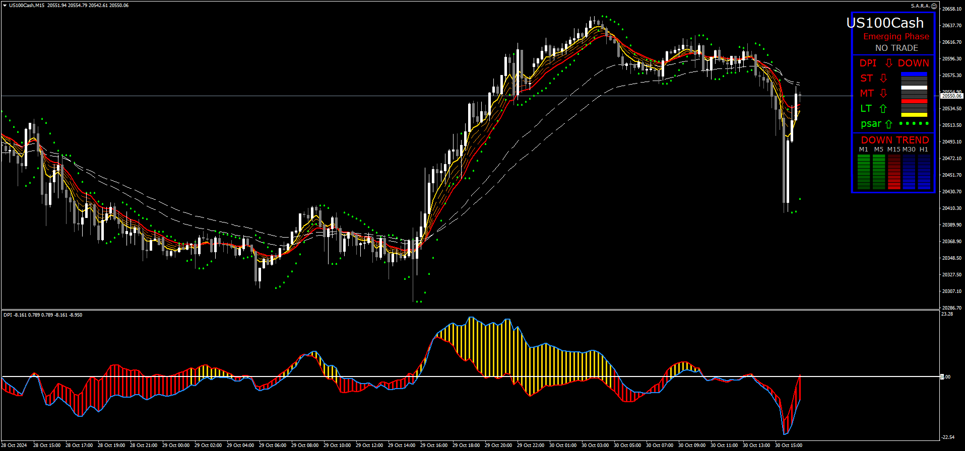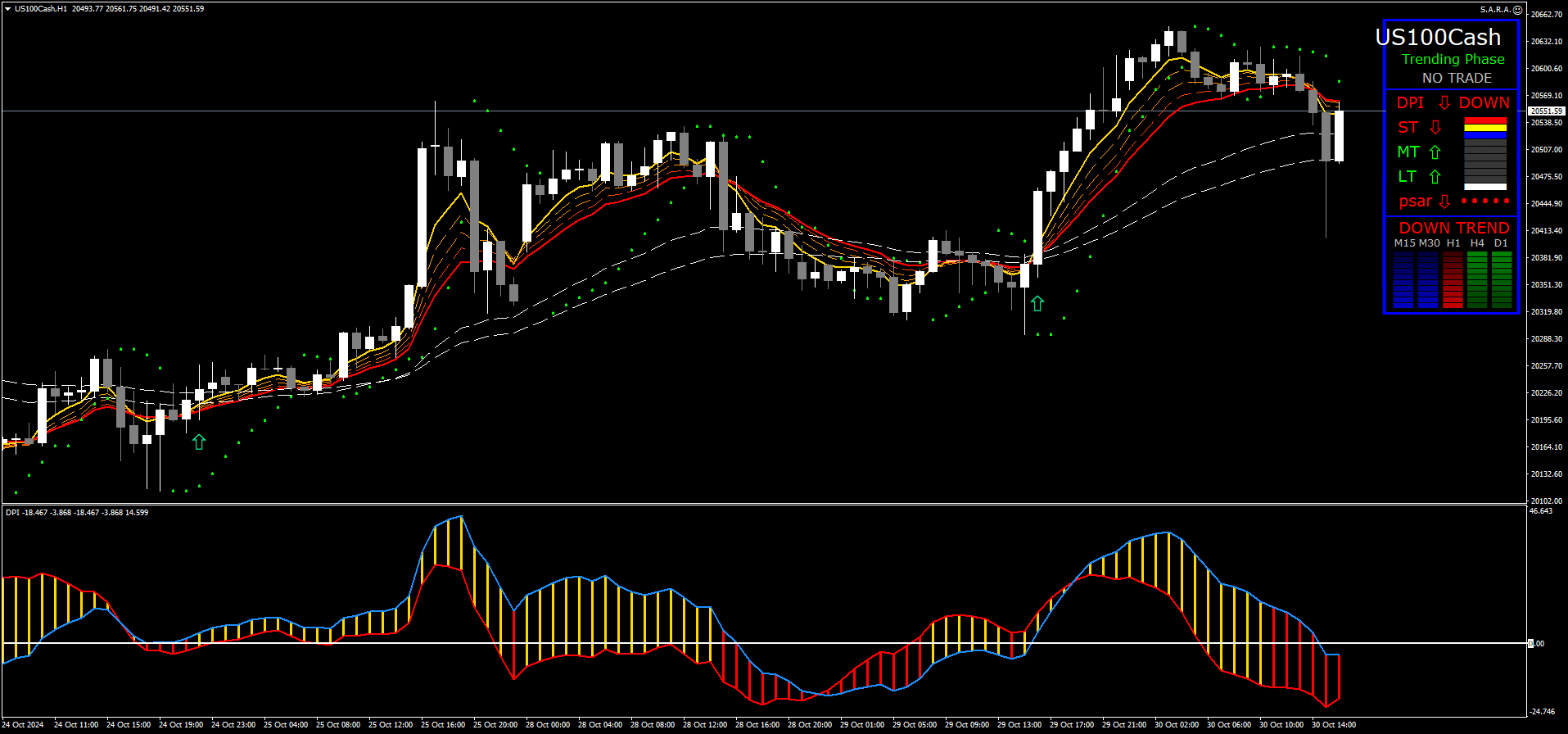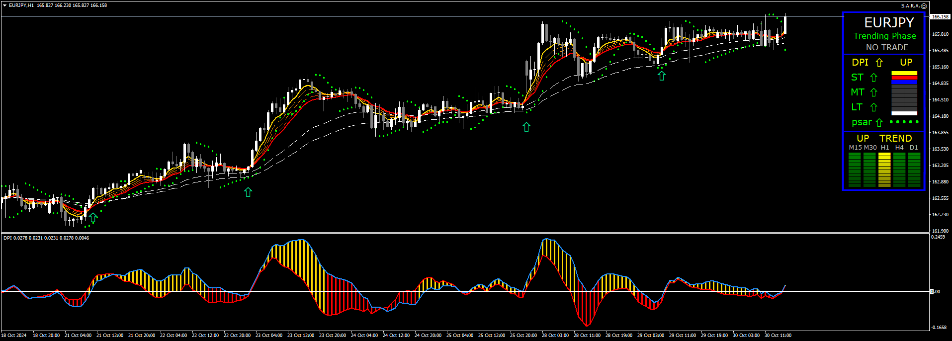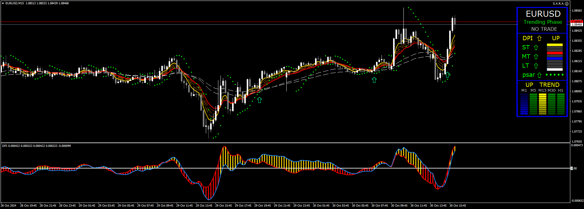 Esta estratégia utiliza uma série de indicadores personalizados no MT4, incluindo o DPI.ex4, Guppy EMAs, Parabolic SAR, e outros. Cada indicador desempenha um papel crucial na análise do mercado e na geração de sinais de compra e venda. Além disso, a estratégia inclui um Expert Advisor (EA) chamado S.A.R.A., que automatiza a execução de entradas e saídas de negociação, tornando o processo mais eficiente e menos suscetível a erros humanos.