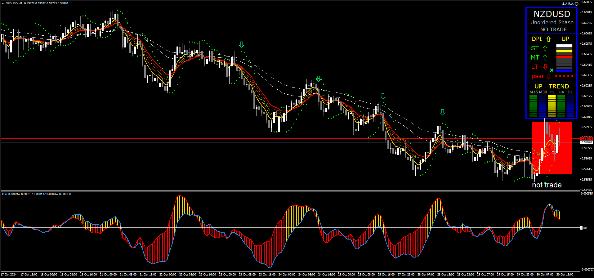 Para gerar um sinal de venda, o DPI.ex4 deve se expandir para baixo, indicando momentum de baixa. As Guppy EMAs devem cruzar umas às outras e se mover para baixo, confirmando a tendência de baixa. O Parabolic SAR deve aparecer acima dos candles de preço, atuando como resistência. Novamente, a verificação do painel de controle é essencial para garantir que todos os indicadores estejam alinhados com a tendência de baixa.