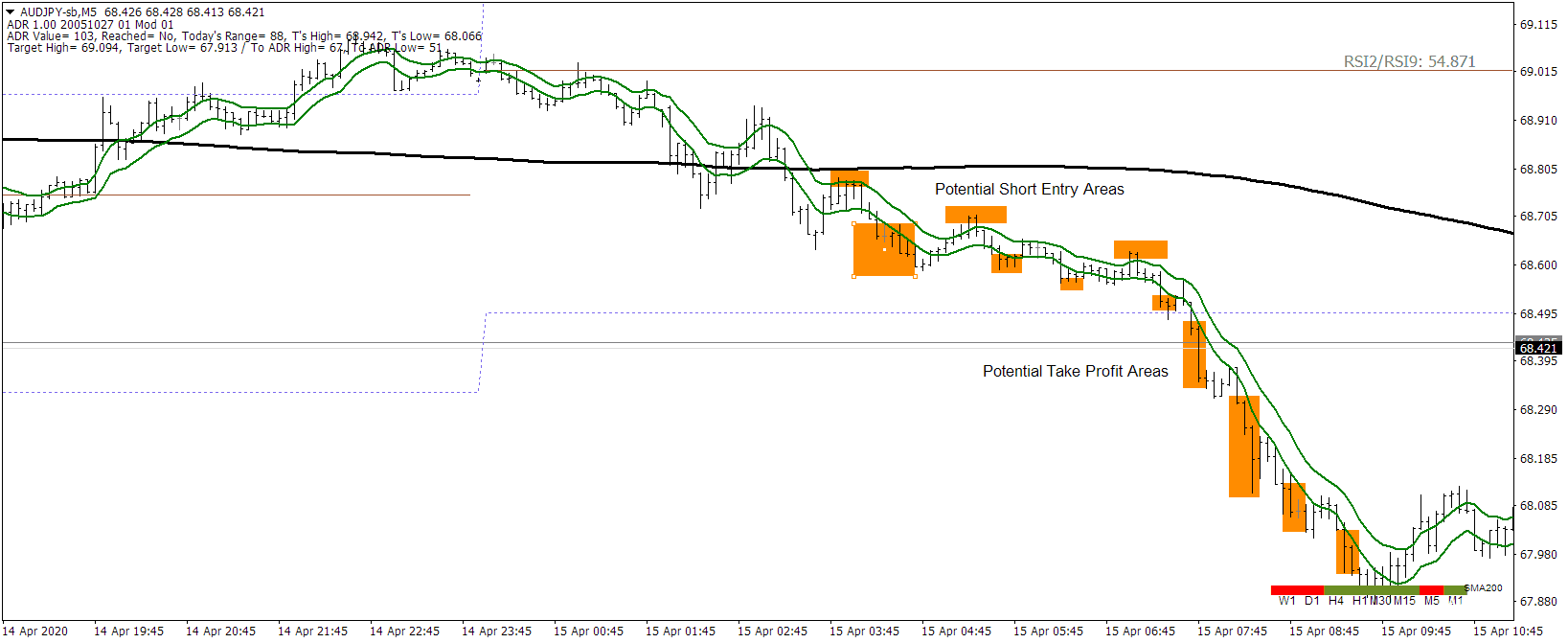 O canal formado pelas médias móveis exponenciais de 8 períodos (EMA8) define a tendência de curto prazo. Posicionado em relação à SMA200, este canal ajuda a determinar viés de curto prazo: acima da SMA200 indica uma inclinação de alta e abaixo, uma inclinação de baixa. Além disso, identificar “falhas de canal” onde o preço tenta, mas falha em ultrapassar a SMA200, pode sinalizar reversões potenciais.