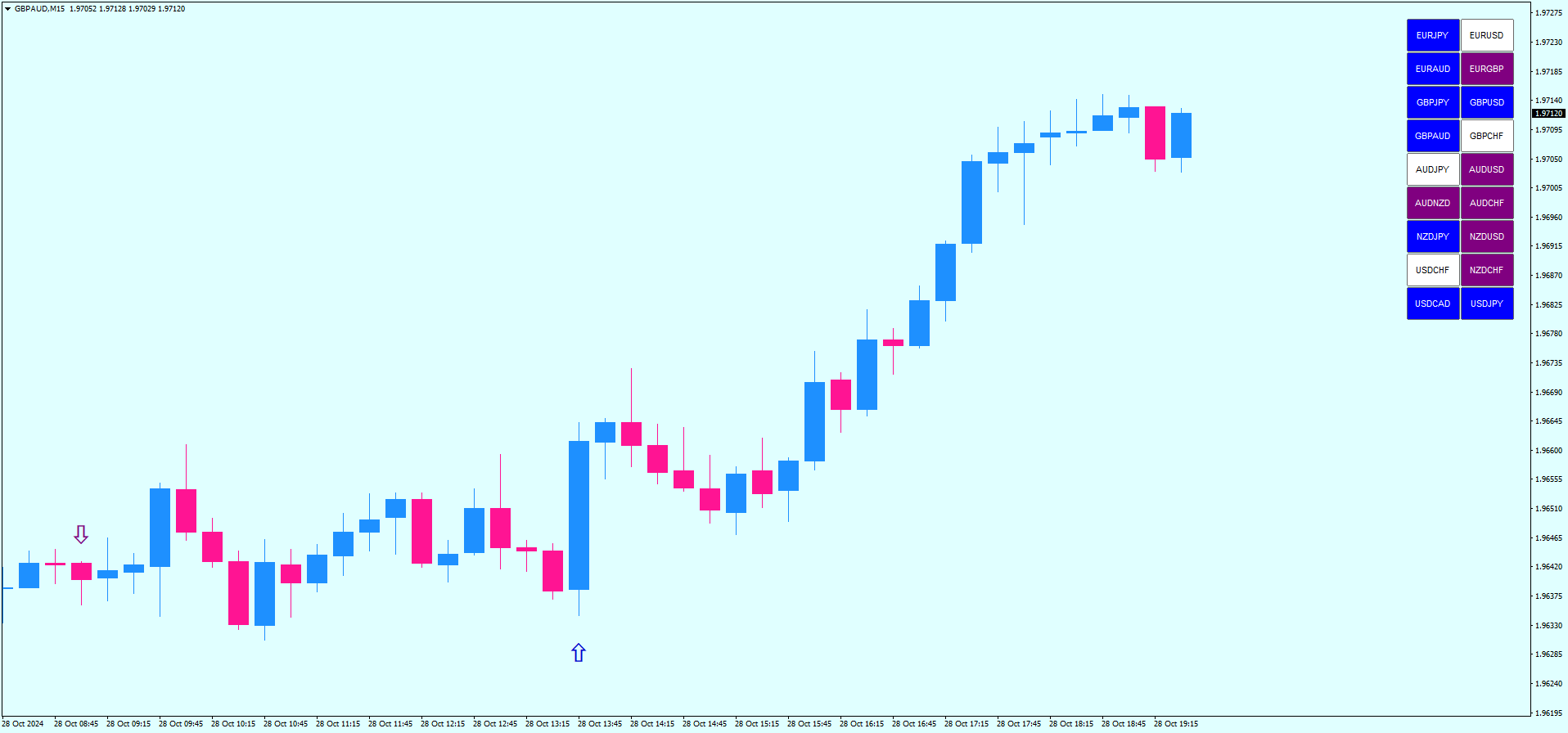 Para uma posição de compra, selecione um par de moedas destacado em azul no Market Scanner e aguarde até que uma flecha azul para cima apareça. Para uma posição de venda, selecione um par de moedas destacado em roxo no Market Scanner e aguarde até que uma flecha roxa para baixo apareça.