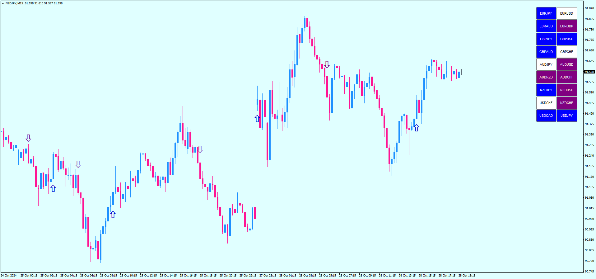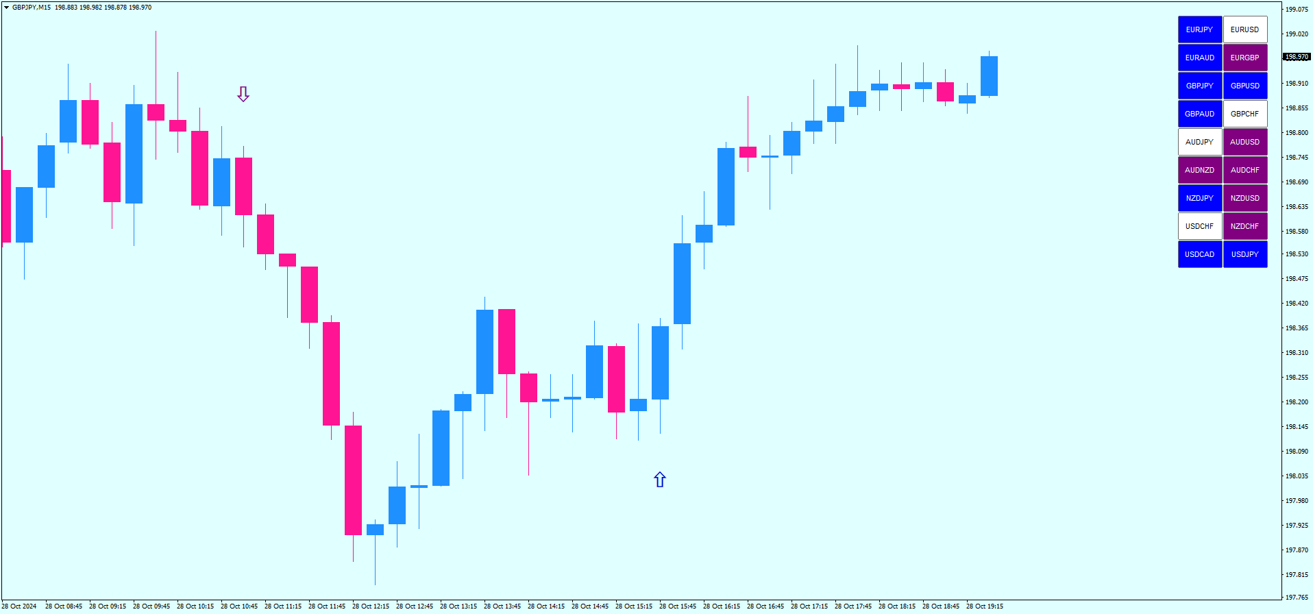 O Market Scanner é uma ferramenta essencial para identificar a direção da tendência em diferentes pares de moedas. Ele analisa vários pares de moedas simultaneamente e fornece uma visão clara da tendência atual. A cor azul indica uma tendência de alta, sugerindo que o preço está subindo, enquanto a cor roxa indica uma tendência de baixa, sugerindo que o preço está caindo. Este indicador é crucial para selecionar os pares de moedas certos para negociação.