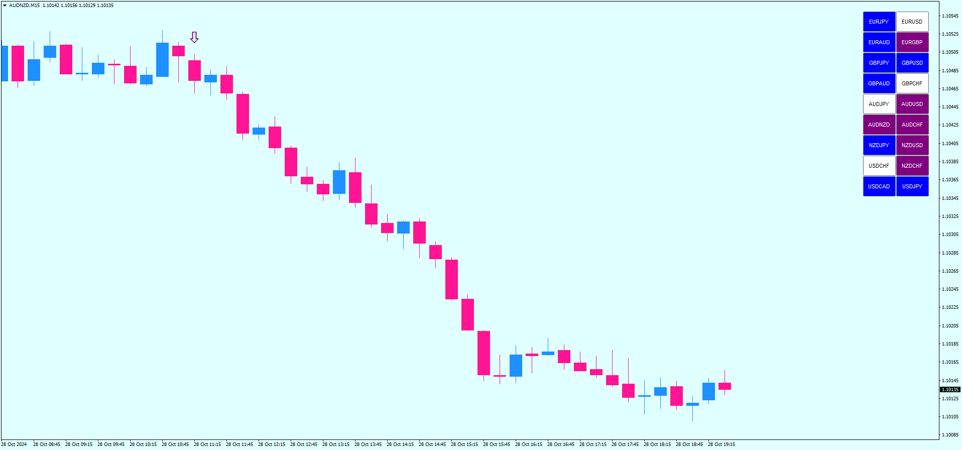 Agora, suponha que você esteja monitorando o par GBP/USD e o Market Scanner mostra uma cor roxa, indicando uma tendência de baixa. Você aguarda até que uma flecha roxa para baixo apareça no gráfico. Quando isso acontece, você entra em uma posição de venda. Coloque o stop loss no swing high anterior e defina um alvo de lucro com uma relação risco-recompensa de 1:1.3.