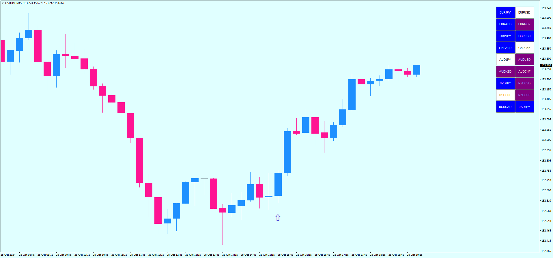 Suponha que você esteja monitorando o par EUR/USD e o Market Scanner mostra uma cor azul, indicando uma tendência de alta. Você aguarda até que uma flecha azul para cima apareça no gráfico. Quando isso acontece, você entra em uma posição de compra. Coloque o stop loss no swing low anterior e defina um alvo de lucro com uma relação risco-recompensa de 1:1.3.