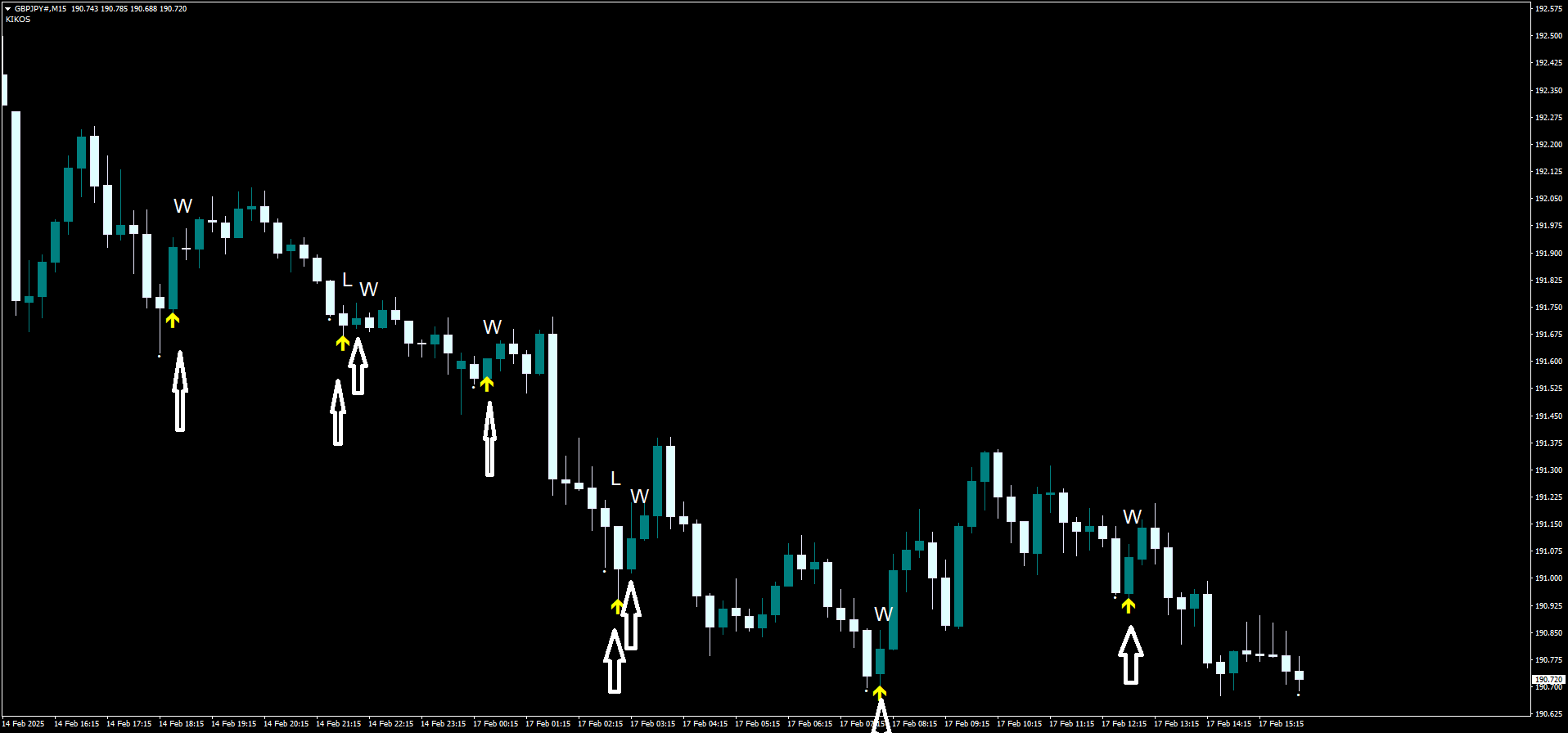 - Um ponto branco aparece, seguido por uma seta para cima (sinal de compra).