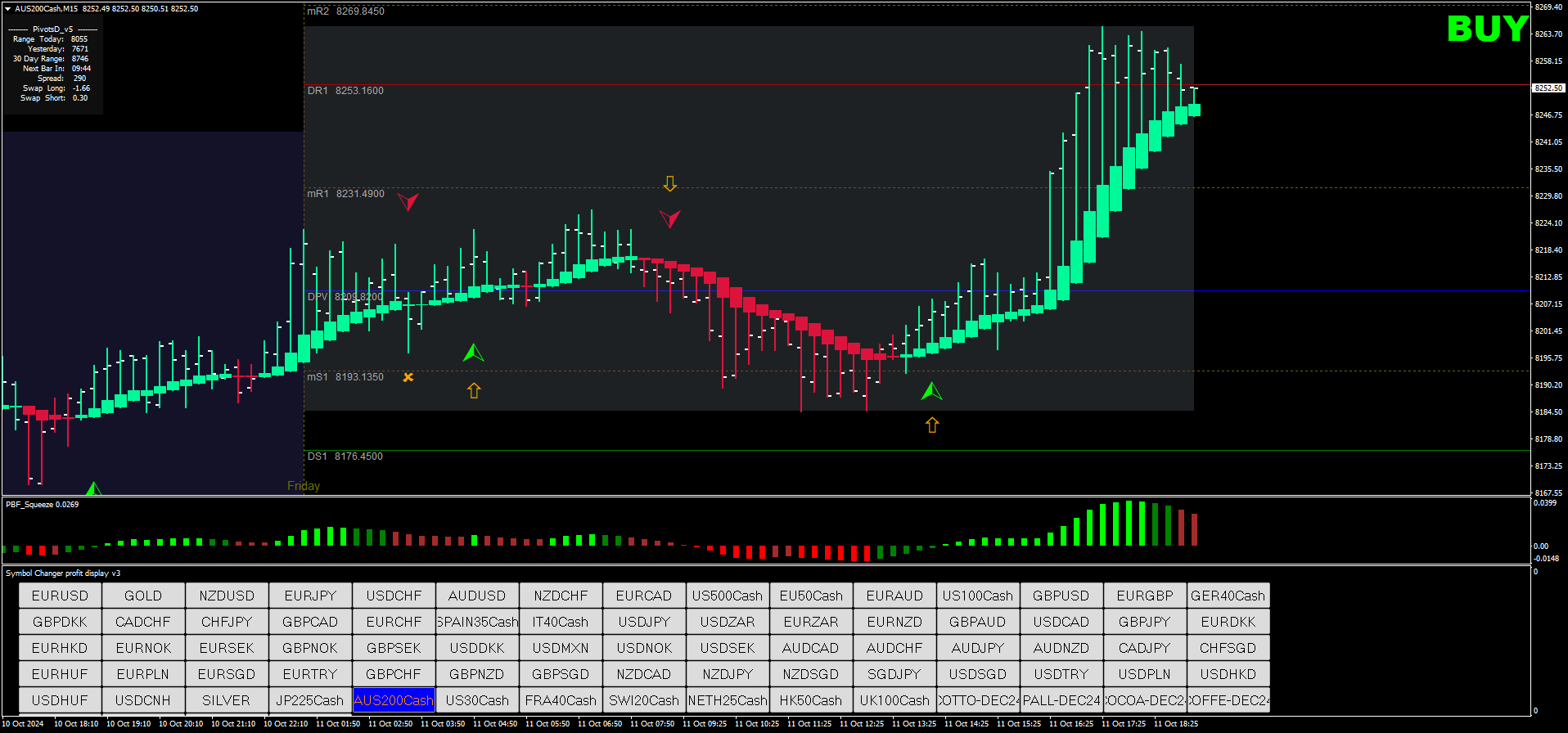 No gráfico de 15 minutos do GBP/JPY, você observa candles Heikin Ashi verdes sem pavios inferiores, indicando uma tendência de alta forte. O Holy Grail 1.7 desenha uma seta de compra, e o histograma do PBF Squeeze é verde, confirmando o momentum alcista. O preço está acima do pivô central e se dirige para R1. Este é um sinal claro para entrar em uma posição de compra.