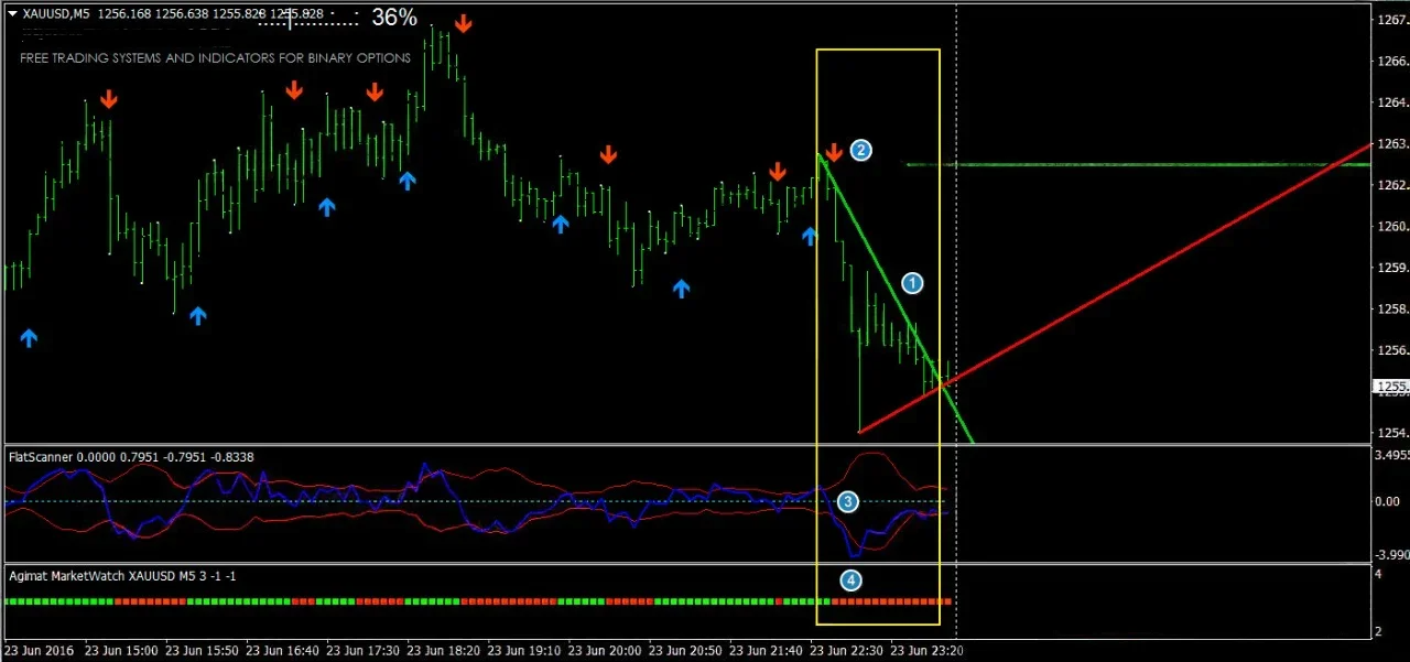 A estratégia se baseia na interpretação correta da ideia de mercado, combinando métodos para mercados em tendência e em consolidação. Durante um forte movimento de mercado, a inércia é alta, o que pode fazer com que os sinais apareçam cedo demais. Para mercados em tendência, é recomendável escolher um período de expiração mais longo.