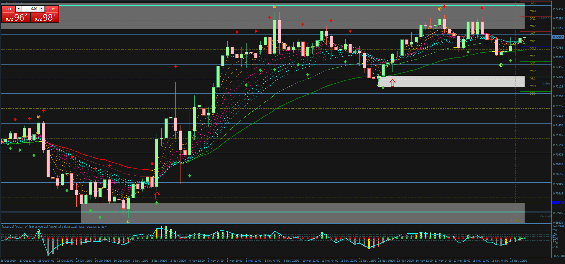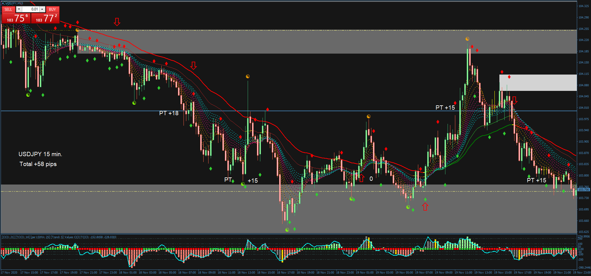 - O Woodie CCI esteja abaixo de 0 e exiba um quadrado vermelho.