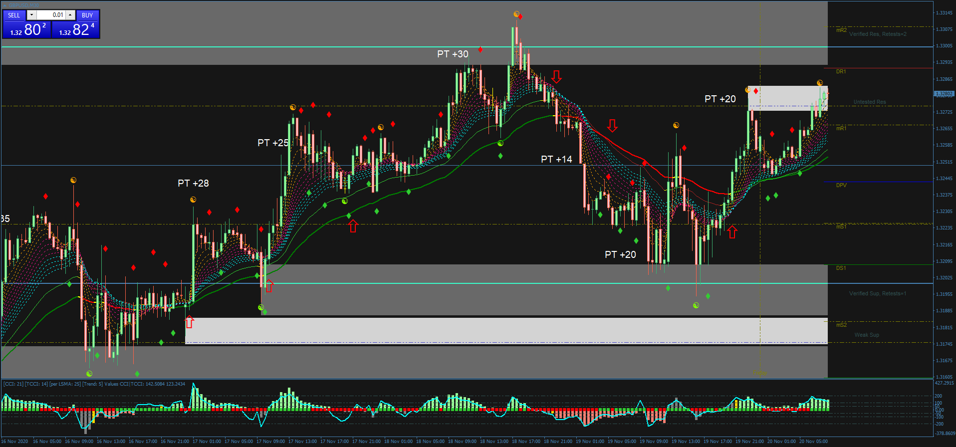- Alvo de lucro nos níveis de ponto pivô, antes da zona de oferta e demanda ou quando as médias móveis mudarem de direção.