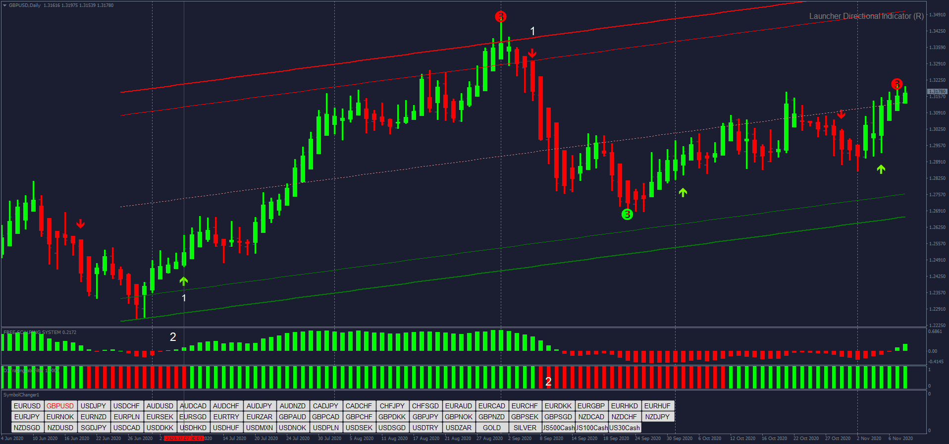 O Asctrend é o primeiro sinal de entrada. Ele gera setas de compra e venda com base em padrões de movimento de preço. Uma seta de compra ou venda é gerada quando o sistema detecta uma oportunidade favorável para entrar no mercado.