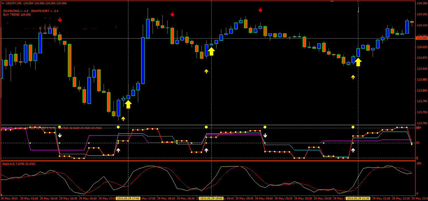 O Relative Strength Index (RSI) é um indicador de momentum que mede a velocidade e a mudança dos movimentos de preço. No contexto desta estratégia, o RSI ajuda a confirmar os sinais de compra e venda gerados pelas setas de sinal.