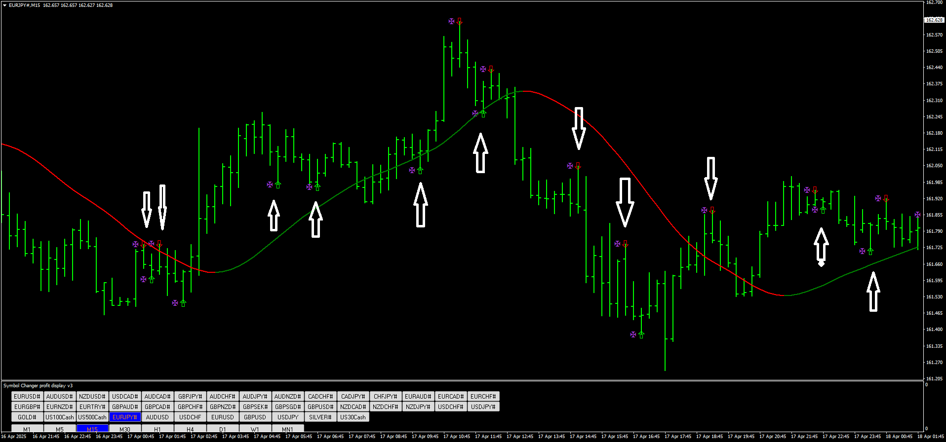 A estratégia HMA Tendência de Pulso não nasceu em um laboratório teórico. Ela foi moldada no calor real dos gráficos de 15 minutos, onde o tempo de reação e a precisão são vitais. Em vez de sobrecarregar o gráfico com indicadores conflitantes, ela utiliza apenas dois elementos-chave: a média móvel Hull de 80 períodos para identificar a direção da tendência com suavidade e agilidade, e um indicador de sinais binários que marca possíveis reversões com alertas visuais e setas de direção.