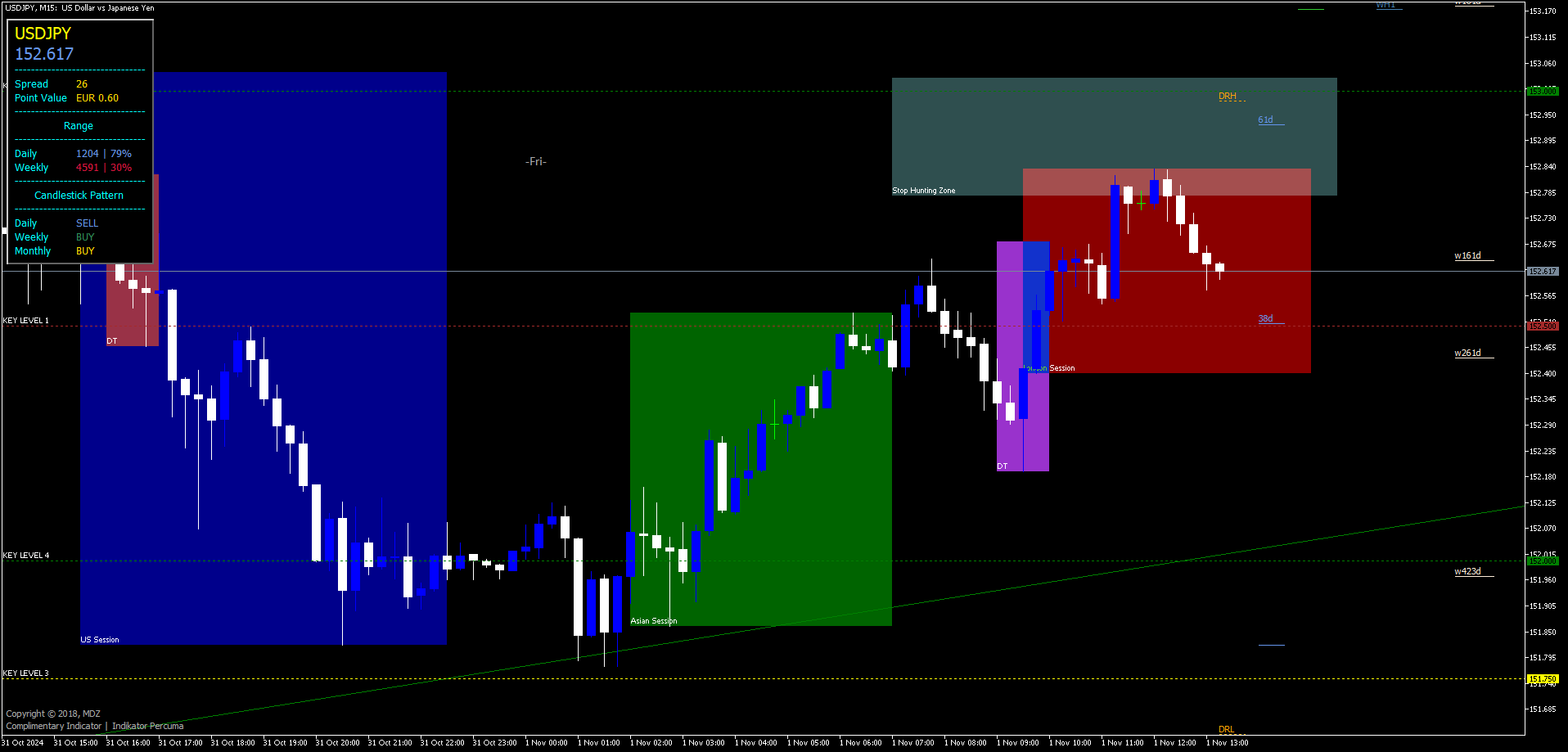 Diferentes sessões de negociação (Asiática, Europeia e Americana) têm características únicas, como níveis de volume e volatilidade. O Indicador MDZ destaca essas sessões, fornecendo aos traders insights sobre quando o mercado provavelmente experimentará maior atividade e liquidez.