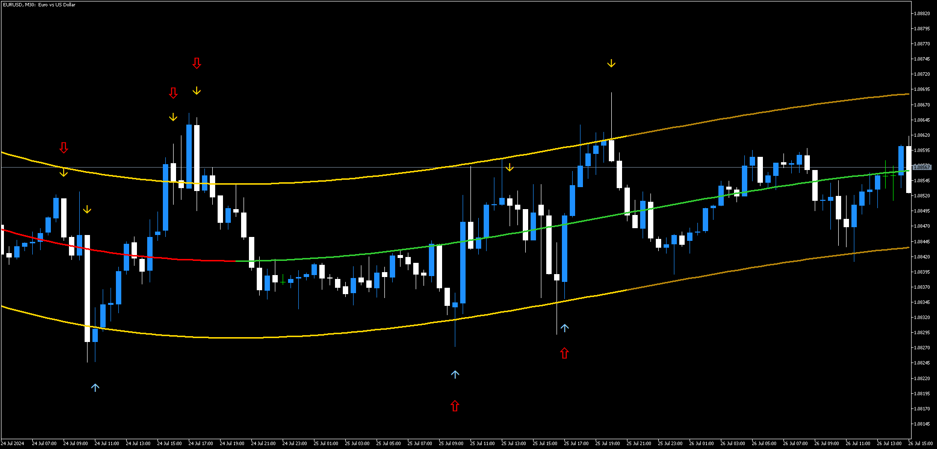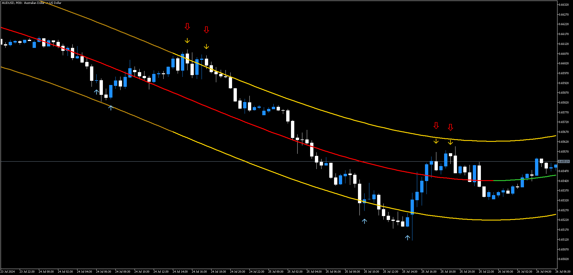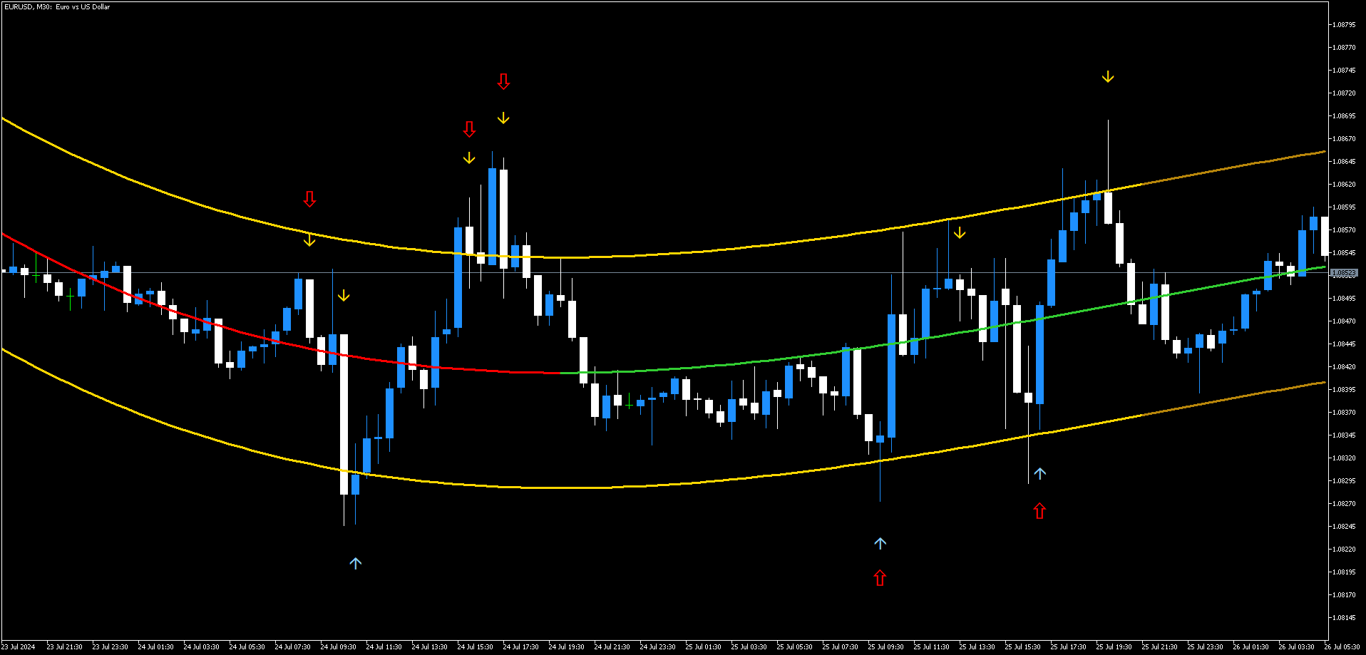 As Setas TMA são usadas para sinalizar entradas potenciais de trade quando alinhadas com a direção da tendência indicada pela regressão polinomial. Essas setas aparecem quando o preço atinge níveis críticos próximos às bandas da regressão, indicando uma possível reversão ou continuação da tendência.